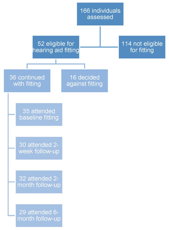 Of the 166 individuals assessed, 36 participants were fitted with hearing aids (Figure 1). 16 eligible individuals declined the fitting (30.8%), citing reasons such as lack of interest in hearing aids or no perceived hearing difficulty. The average age of the fitted participants was 76 years (SD = 8.9; range 50–96), with 63.9% (n = 23) female and 36.1% (n = 13) male participants. Figure 1 illustrates participant recruitment and follow-up attendance numbers. Attendance and analysis denominators were: fitting n = 35, 2 weeks n = 30, 2 months n = 32, and 6 months n = 29. For any consecutive-visit comparison, the n reflects only participants present at both visits; these denominators are shown in the table/figure footnotes. Participant data was not recorded if they did not attend the scheduled in-person visits, did not bring their hearing aids, or completed a phone interview where CHWs could not manually check program selections.