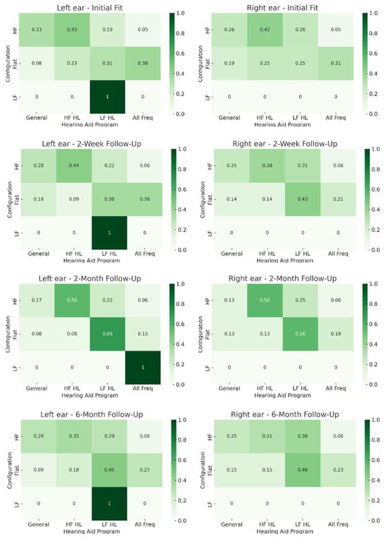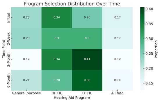 Program selection varied by hearing loss configuration as shown in the combined-ear heatmaps (Figure 3). In participants with high-frequency hearing loss, the High-Frequency Amplification program (Program 2) was most frequently chosen (left ear: 43%; right ear: 42%). Over time, those with flat configurations tended toward selection of the Low-Frequency Amplification program (Program 3; left ear: initially 31% to 45% at 6 months, right ear: initially 25% to 46% at 6 months).