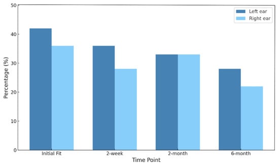 As shown in Figure 4, the proportion of participants selecting the clinically recommended program declined gradually across the follow-up time points. For the left ear, 41.7% (n = 15) initially selected the clinically recommended program, but only 27.8% (n = 10) had the clinically recommended program selected by the 6-month follow-up. A similar trend was observed for the right ear, decreasing from 36.1% (n = 13) to 22.2% (n = 8).