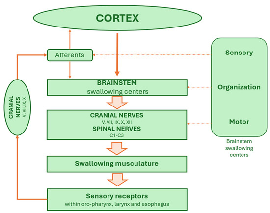 Within the NTS, premotor neurons are known to integrate convergent inputs originating from both cortical and peripheral sources that contribute to the initiation of swallowing [3,4]. This integration is particularly critical for the execution of volitionally initiated swallowing. During such feeding behaviors, descending cortical signals are believed to reach the NTS as the first step in triggering the swallow response. Consequently, sequential actions such as eating and drinking can be voluntarily initiated or modulated by the cerebral cortex through its influence on the brainstem’s CPG network [5,6,7,8]. Therefore, in the case of voluntary swallowing, cortical and subcortical regions implicated in deglutition primarily function to initiate the swallowing process and to govern the onset of its motor sequence—particularly the oral phase [6]. Following this initial cortical input, the remainder of the swallowing sequence—namely, the pharyngeal and esophageal phases—is executed in a stereotyped manner, without requiring further cortical involvement [3,5].