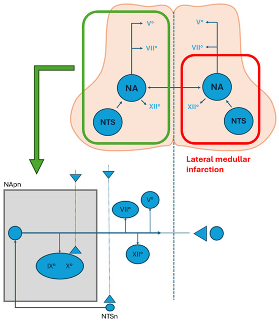 Figure 2. Representation of the swallowing centers and their connection with cranial nerves nuclei in the medulla oblonga. The area limited by the red line represents a lateral medullary infarction and the involvement of the nucleus of tractus solitarius (NTS) and the nucleus ambiguous (NA). The bottom figure represents the premotor neurons and their ipsilateral connection to the cranial nerve pools and the controlateral swallowing center (modified from Aydogdu et al., 2001) [31]. (NA: nucleus ambiguus; NTS: nucleus of tractus solitarius; NTpn: nucleus ambiguus premotor neurons; NTSn: nucleus tractus solitarius neurons).