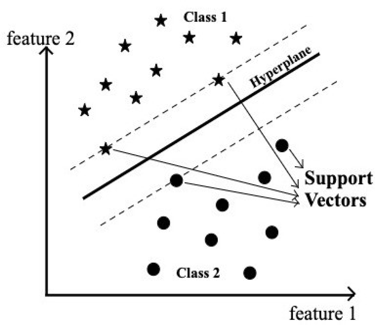 Figure 2. The data points lying on the margin on either side of the hyperplane are called support vectors. In our experiment, SVM was employed as a classification algorithm because of its better classification performance compared to any other machine learning algorithms [