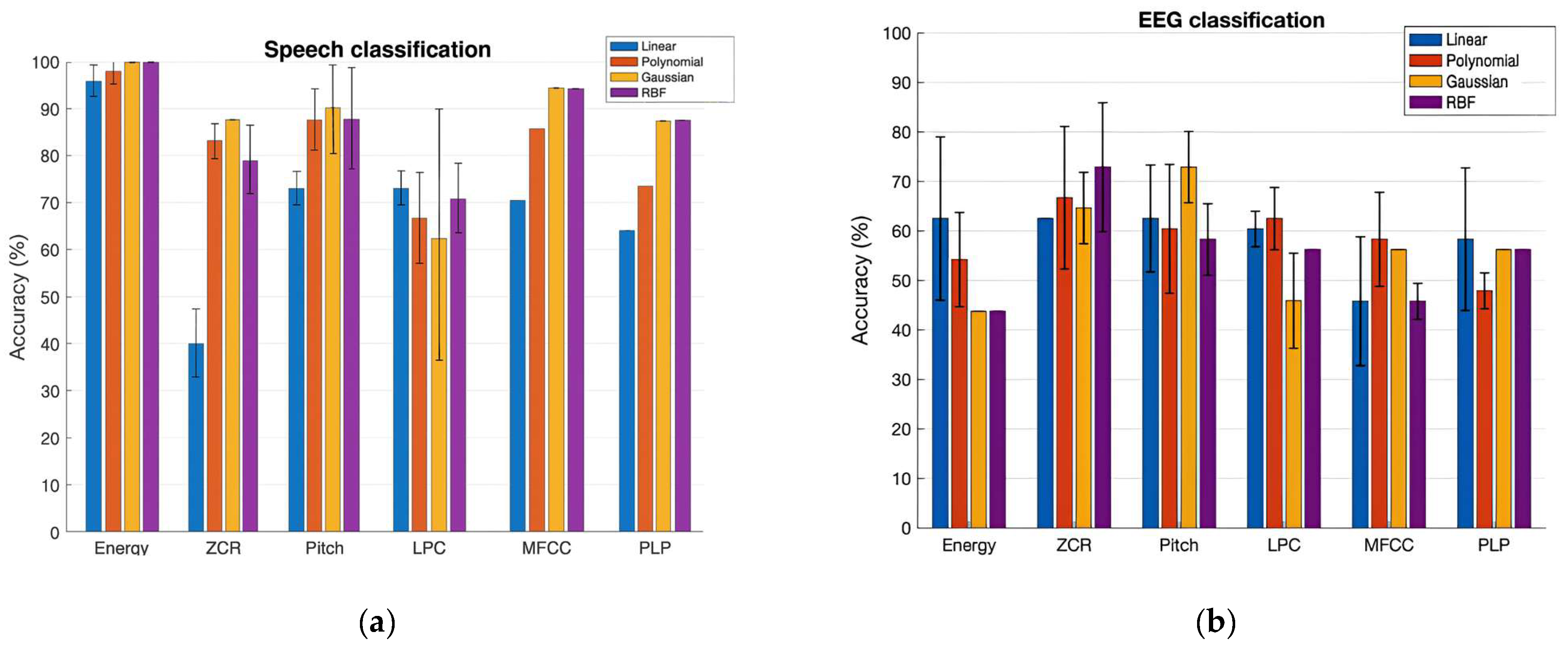 Figure 3a (left panel) show the prediction performance of the SVM classification of NH and CI speech with a set of six features. The bar plot shows the accuracy values of the classification in percentages for the Linear, Polynomial, Gaussian, and RBF Kernels in that order. The variation in the performances of each kernel across three runs is shown in the plot by error bars. Interpreting the results, the Gaussian and RBF kernels both yielded the best accuracy values, achieving 100% with the Energy feature and 94% with the MFCCs feature, respectively. Our experiment’s outcome supports the previous studies, in that the RBF generally outperforms the Linear and Polynomial kernels, as it ensures minimal approximation error in classification problems. This is also true for the Gaussian kernel, since it is one of the forms of RBF kernel.