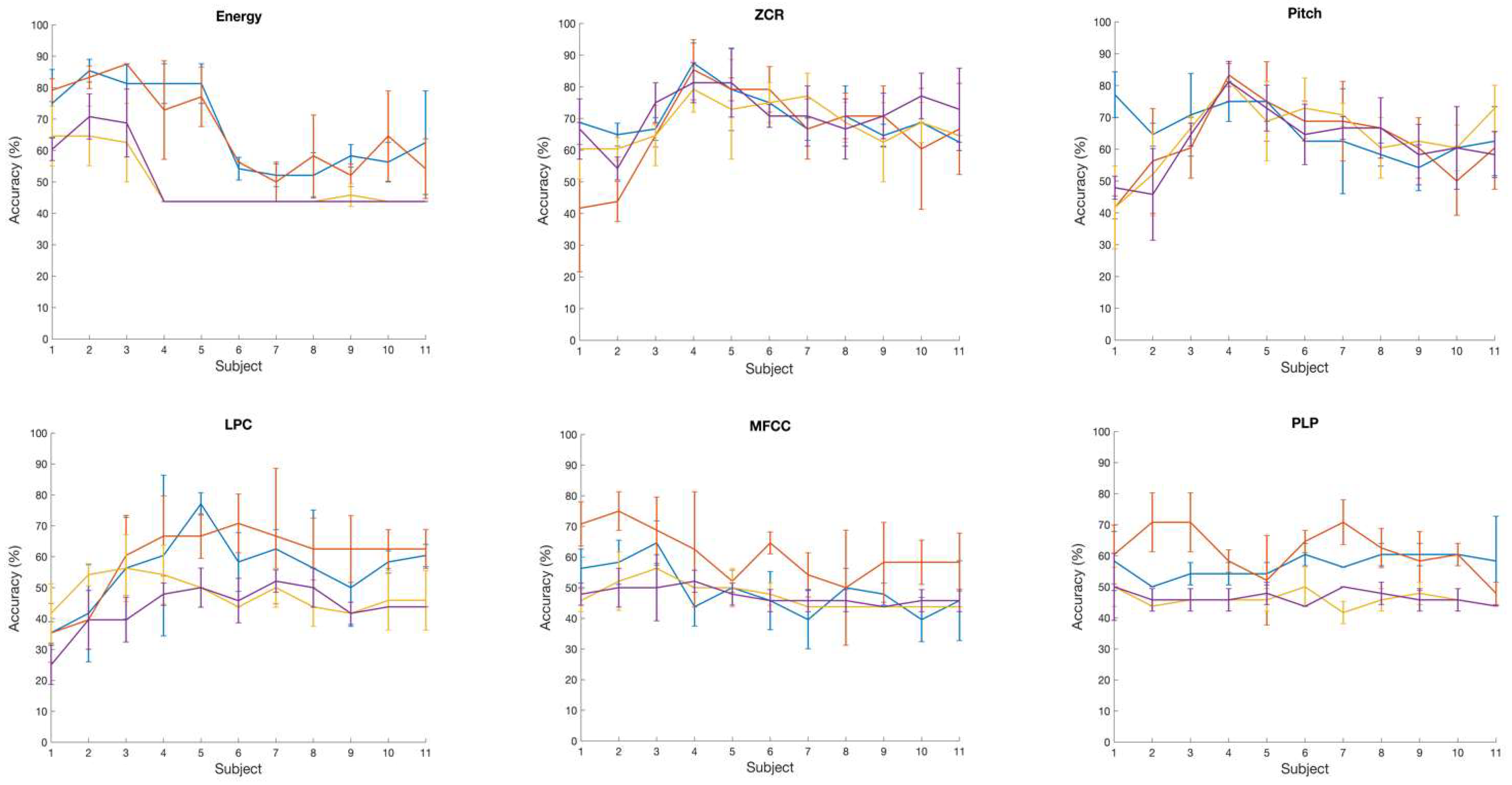Figure 4 shows the variation in accuracy while increasing the number of subjects, showing the calculated average accuracy and also the standard deviation across three runs with six different brain wave features. With the Log Energy, ZCR, Pitch, and MFCC features, a modest increase in classification accuracy was numerically observed when data from approximately four to five subjects were included; however, given the small sample size and the variability across runs, this observation should be interpreted qualitatively rather than as a statistically significant trend. The apparent pattern was derived from mean accuracy values across three cross-validation runs, but no formal statistical testing was performed due to the limited sample size. This observation was not evident with the LPC and PLP brain wave features, for which the variation in accuracy while increasing the number of subjects was almost flat for most of the kernels.