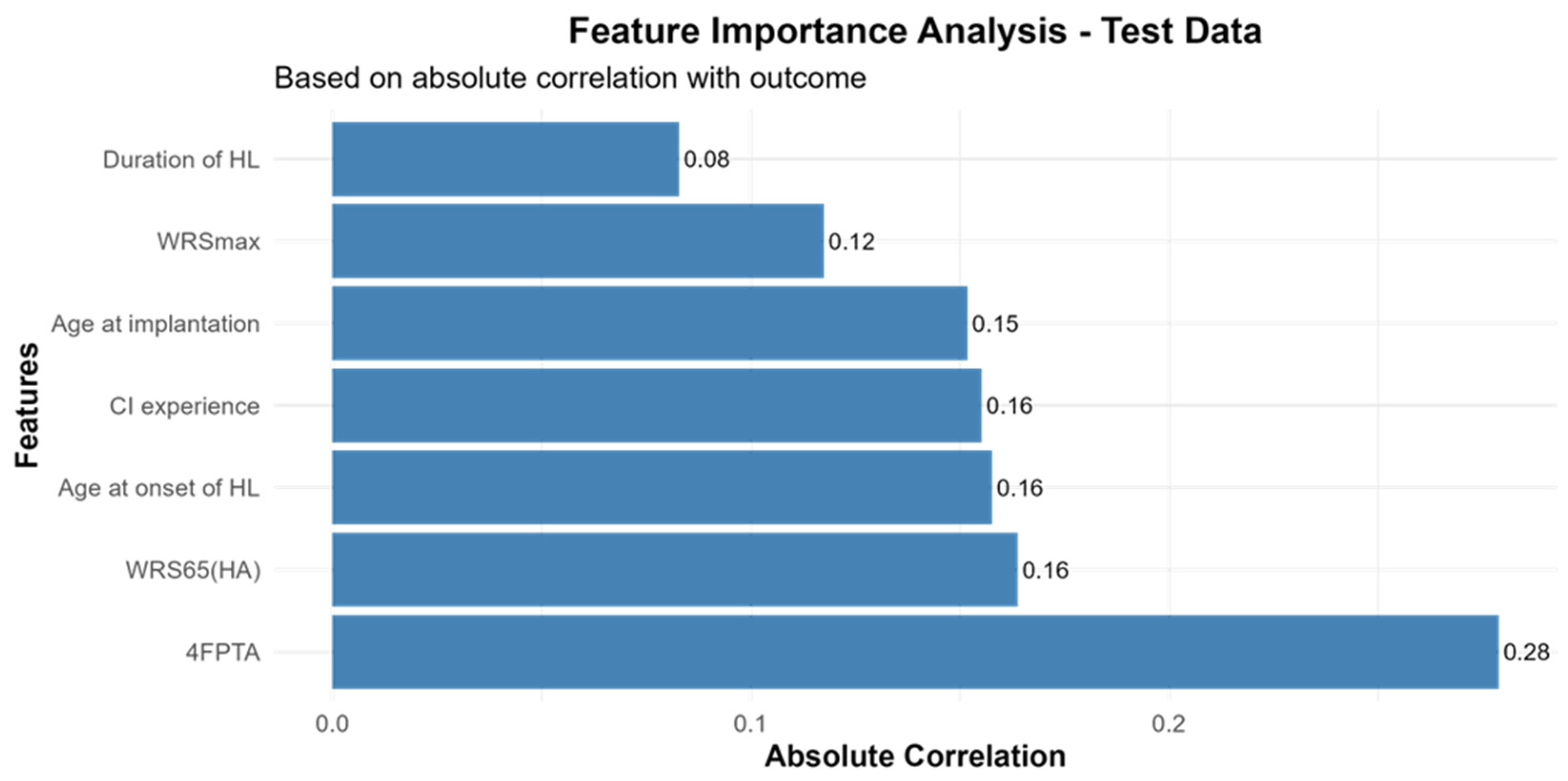 - Demyanchuk, A.; Kludt, E.; Lenarz, T.; Buchner, A. A Machine Learning Model to Predict Postoperative Speech Recognition Outcomes in Cochlear Implant Recipients: Development, Validation, and Comparison with Expert Clinical Judgment. J. Clin. Med. 2025, 14, 3625. [Google Scholar] [CrossRef] [PubMed]