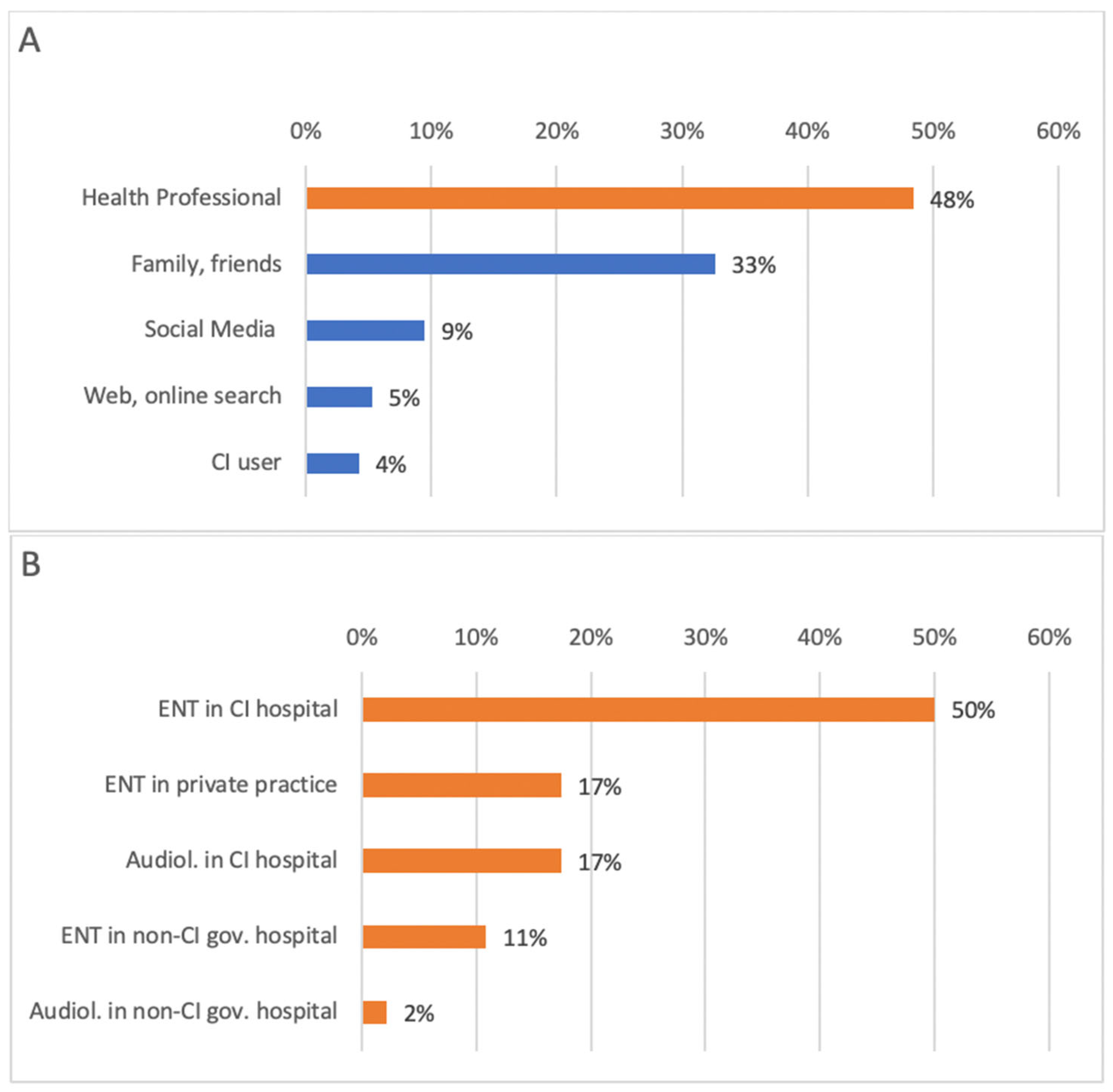 - Chundu, S.; Buhagiar, R. Audiologists’ knowledge of cochlear implants and their related referrals to the cochlear implant centre: Pilot study findings from UK. Cochlear Implant. Int. 2013, 14, 213–224. [Google Scholar] [CrossRef] [PubMed]