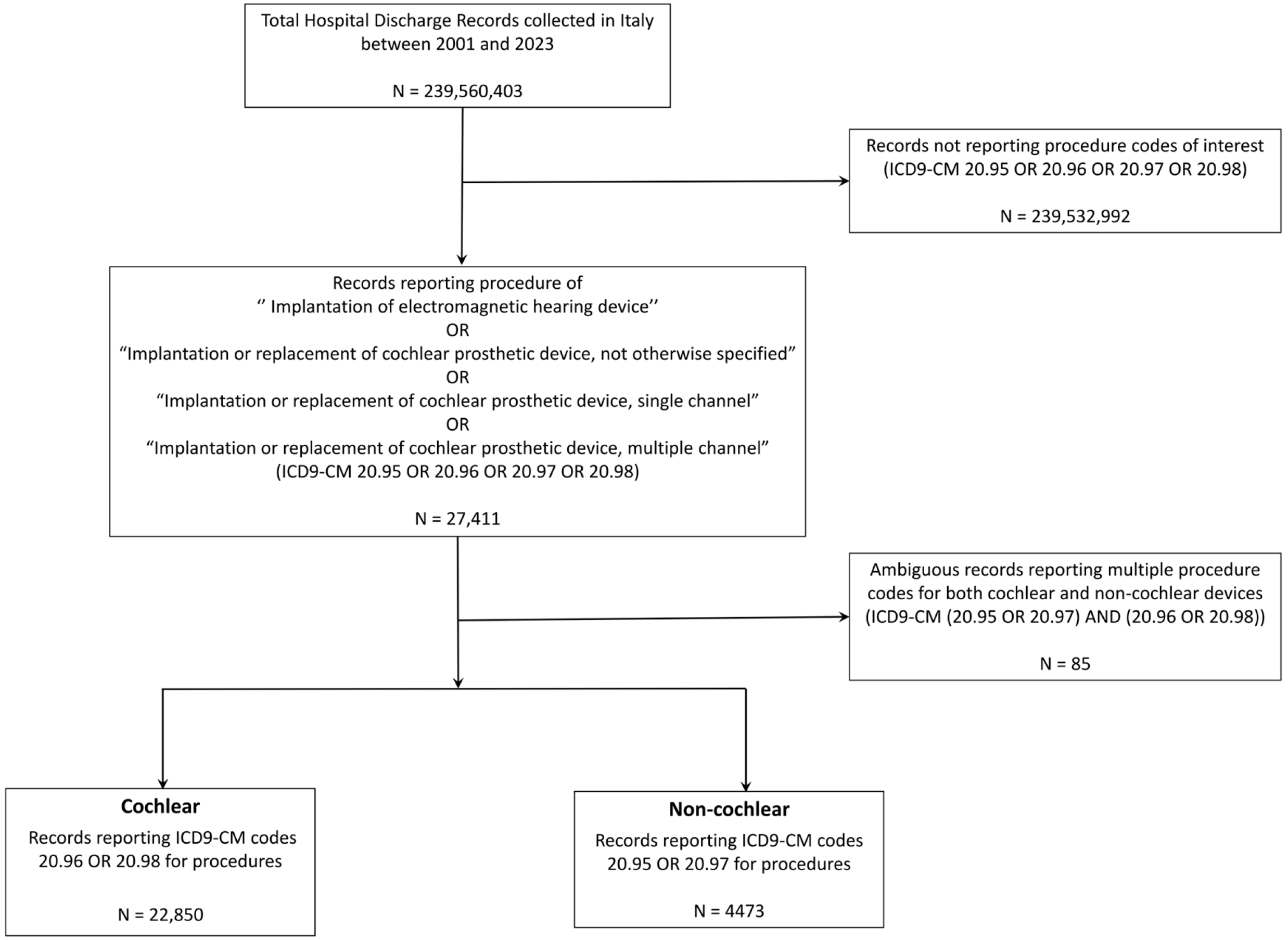 Ciminello E, Cuda D, Forli F, Fetoni AR, Berrettini S, Mattei E, Falcone T, Cuccu A, Ciccarelli P, Ceccarelli S, et al. Trends and Incidence of Hearing Implant Utilization in Italy: A Population-Based Study. Audiology Research. 2025; 15(6):175. https://doi.org/10.3390/audiolres15060175