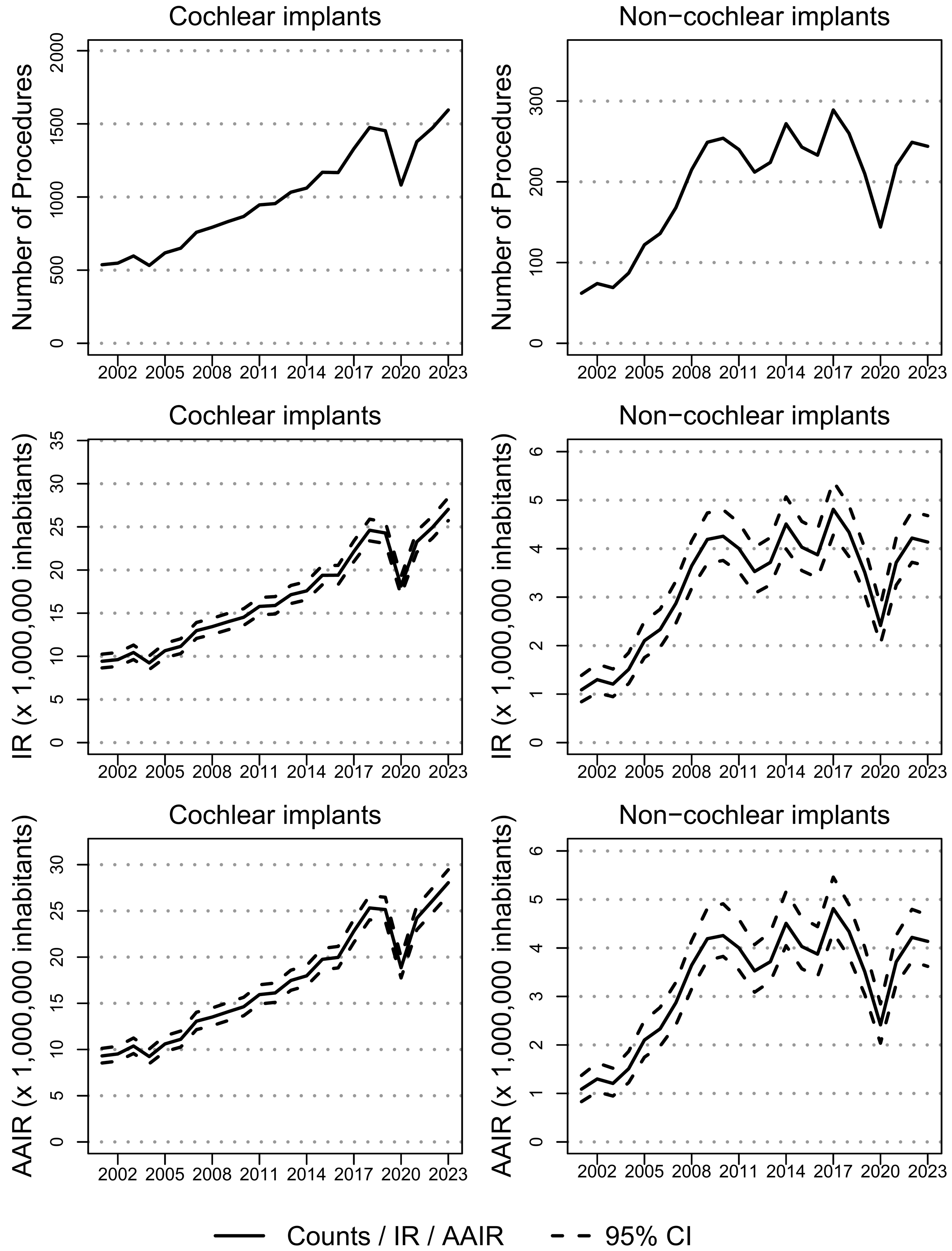 Ciminello, E.; Cuda, D.; Forli, F.; Fetoni, A.R.; Berrettini, S.; Mattei, E.; Falcone, T.; Cuccu, A.; Ciccarelli, P.; Ceccarelli, S.; et al. Trends and Incidence of Hearing Implant Utilization in Italy: A Population-Based Study. Audiol. Res. 2025, 15, 175. https://doi.org/10.3390/audiolres15060175