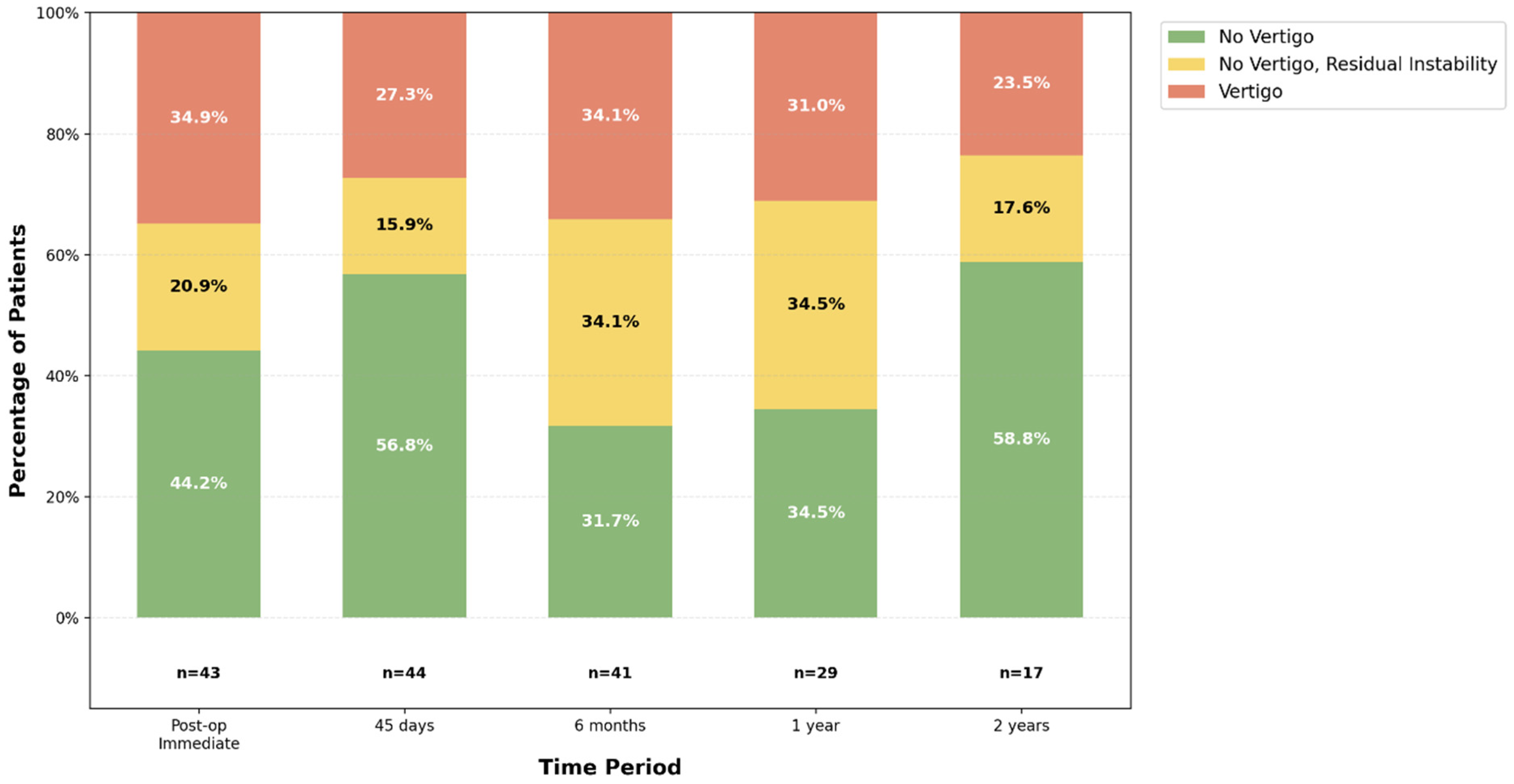 | Presence of preoperative Tumarkin attacks | 9/45 (20%) | 7/30 (23.3%) | 2/15 (13.3%) | p = 0.43 |