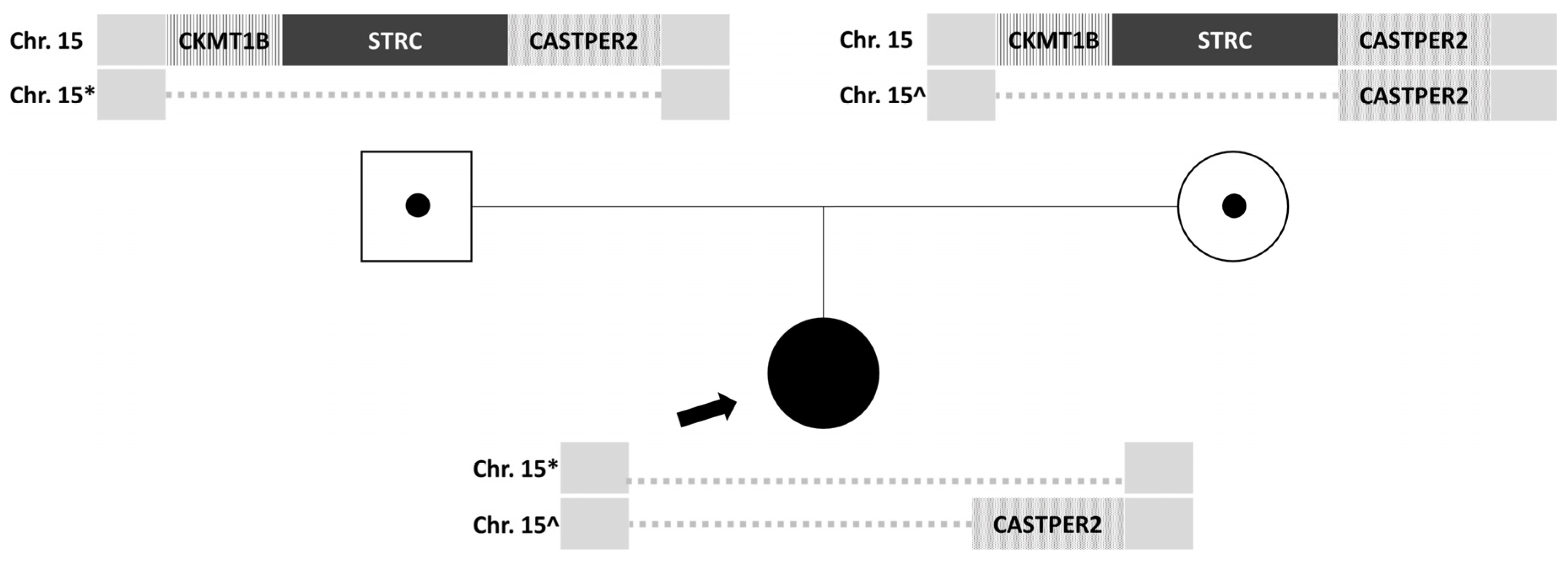 STRC genes in the mother. Both parents were carriers of a heterozygous deletion without clinical manifestations, which they transmitted to their daughter with a 25% probability. The patient has inherited deletions of different sizes from each of her parents, resulting in a homozygous loss of gene
