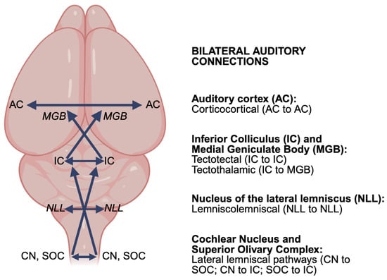 Integrating binaural sound information requires that auditory information from both ears be conveyed and combined through bilateral neural connections that cross the midline throughout the central auditory system (Figure 1) [53,54]. Much of the data regarding binaural neural circuitry is derived from a wide range of animal species, e.g., cats, rats, mice, bats, gerbils, etc. Specialized neuroethological adaptations of the basic auditory neural circuits exist across species, e.g., due to head size or communication abilities, but are summarized more generally here as they pertain to humans. Broadly, after the initial neural encoding of sound in the cochlea, auditory information is sent to the cochlear nucleus (CN) via the auditory nerve [55,56]. Thereafter, the first site of binaural convergence is the superior olivary complex (SOC) of the brainstem, which receives projections from both CNs [57,58,59]. The binaural information computed in the SOC is relayed to the nuclei of the lateral lemniscus (NLL) and integrated within the inferior colliculus (IC) in the midbrain [60,61,62]. From the IC, projections ascend to the medial geniculate body (MGB) of the thalamus and then to the auditory cortex [63,64,65,66]. Overall, the brainstem SOC is the most intensively investigated structure for the bilateral integration of auditory information, although bilateral connections are also prevalent in higher auditory structures, although their functional contributions are less clear [57,58,59,67,68].