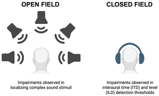 Binaural hearing assessments can be performed in either an open- or closed-field environment (Figure 2), e.g., [41,129]. Open-field (or free-field) tasks typically involve an array of sound speakers that are situated at different horizontal and vertical displacements relative to the listener. In contrast, closed-field tasks involve sound stimuli presented directly to the listener via headphones. As with most experimental setups, each has unique advantages and disadvantages [34,130]. Open-field tests enable assessment of complex acoustic, environmental, and head-related cues, while closed-field tests enable fine control of direct aural stimulation, e.g., independent control of ITDs and ILDs. In each setup, the type and pattern of acoustic stimuli can be carefully designed to probe the spectral and temporal responsiveness of the listener. And, in the case of ASD, each type of test has implicated impairments to binaural hearing.