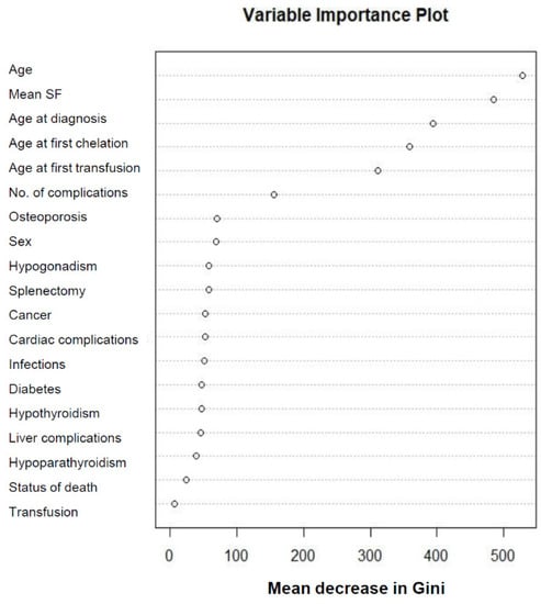 Variable importance plot of indicators of phenotype severity (IPhS) in β-thalassemia from unsupervised random forest (RF) analysis. SF, serum ferritin.