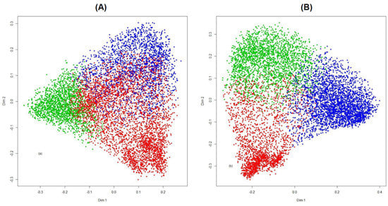 (A) Plot of the 7910 β-thalassemia patients visualized using a multidimensional scaling plot based on the random forest (RF) dissimilarity of all 19 indicators of phenotype severity (IPhS). (B) Plot of the 7910 β-thalassemia patients visualized using a multidimensional scaling plot based on the RF dissimilarity of the 6 most important IPhS. Points of the same color represent patients belonging to the same cluster. Patients are colored by their cluster membership (red for Cluster 1, green for Cluster 2, and blue for Cluster 3).