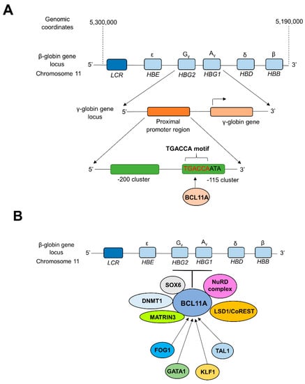 BCL11A-mediated transcriptional silencing of γ-globin. (A) Direct repression of the promoter region of γ-globin genes by BCL11A. Interactions between zinc finger motifs of BCL11A and the proximal TGACCA motif (−118 to −113) of γ-globin promoter silence the expression of γ-globin during fetal to adult hemoglobin switching [86,89]. (B) Long-range interactions of BCL11A with multi-protein complexes and transcription factors. The level of expression of BCL11A is controlled by several transcription factors such as FOG1, GATA1, TAL1, etc. At the same time, BCL11A is capable of repressing the γ-globin expression through long-range interactions and cooperation with multi-protein complexes such as NuRD, DNMT1, MATRIN3, etc. [90,91,92]. LCR; β-globin locus control region, HBE; Hemoglobin Subunit Epsilon gene, HBG1; Hemoglobin subunit Gamma 1 gene, HBG2; Hemoglobin Subunit Gamma 2 gene, HBD; Hemoglobin Subunit Delta gene, HBA; Hemoglobin Subunit Alpha gene. NuRD; Nucleosome Remodeling and Deacetylase, LSD1/CoREST; Lysine Specific Demethylase 1/Repressor Element 1 Silencing Transcription Factor Corepressor 1, MATRIN3; Nuclear Matrix Protein-3, DNMT1; DNA Methyltransferase 1, SOX6; SRY-box transcription factor 6, TAL1; T-cell Acute Lymphoblastic Leukemia 1, KLF1; Kruppel-Like Factor 1, GATA1; GATA binding protein 1, FOG1; Zinc finger protein FOG family member 1.