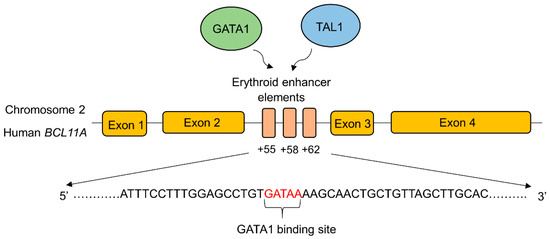 BCL11A expression is transcriptionally upregulated by binding transcriptional activators to the erythroid-specific enhancer region of BCL11A. GATA-1 is a zinc finger transcriptional activator that specifically binds to the GATA-1 transcriptional activator binding sequence (GATA motif) in the erythroid specific enhancer region of BCL11A to enhance its expression [95] (Figure 2).