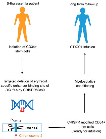 CTX001 therapy workflow. CTX001therapy is a potential one-time gene therapy for TDT and severe SCD that relies on CRISPR/Cas9 gene editing to facilitate the patient’s own cells to produce high levels of HbF. CRISPR/Cas9 system targeting the deletion of erythroid-specific enhancer binding site of BCL11A is introduced into CD34+ stem cells from β-thalassemia patients, resulting in downregulation of BCL11A expression. Subsequent inactivation of BCL11A binding to the Pγ-globin causes reactivation of the γ-globin gene, resulting in fetal globin switch. After quality controlling and clinical testing, CRISPR-modified CD34+ stem cells are introduced into β-thalassemia patient via autologous transplantation, along with myeloablative chemotherapy and immune-suppressive treatments [103,104,105]. PBCL11A; Promoter region of BCL11A gene. ∗ (Asterisk symbol); Indel mutation introduced by CRISPR/Cas9.