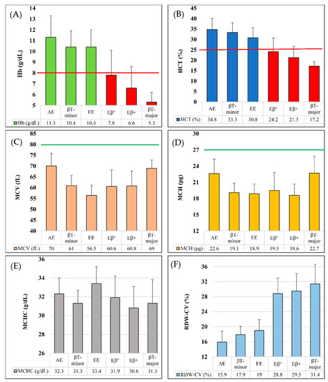 Graphical comparison in different types of thalassemia and hemoglobinopathy. (A). Mean Hb concentration (g/dL), severe anemic cutoff point shown in red line; (B). Mean HCT (%), severe anemic cutoff point shown in red line; (C). Mean MCV (fL), normal cutoff point shown in green line; (D). Mean MCH (pg), normal cutoff point shown in green line; (E). Mean MCHC (g/dL); (F). Mean RDW-CV (%). AE = Hb E (Heterozygous); βT-minor = β-thalassemia (Heterozygote); βT-major = β-thalassemia (Homozygote); EE = Hb E (Homozygous); Eβ° = Hb E/β0-thalassemia; Eβ+ = Hb E/β+-thalassemia.