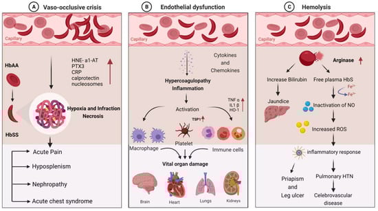 Hematocrit, plasma viscosity, and erythrocyte deformability are some factors that affect blood rheology. Sickled RBCs become mechanically trapped in the microcirculation, promoting adhesive events among blood cells and resulting in chronic vaso-occlusion, causing frequent episodes of pain, hemolytic anemia, organ damage, and premature death [43,44]. Sickled RBCs also promote the exposure of adhesion molecules and binding motifs that are not generally found on RBCs’ outer membranes, such as phosphatidyl serine (PS), basal cell adhesion molecule-1 (B-CAM1), integrin-associated protein (IAP), and intercellular-adhesion-molecule-4 (ICAM-4). Sickled RBCs also have an integrin complex on their surface, which binds to fibronectin and vascular-cell adhesion molecule 1 (VCAM1), expressed on endothelial cells’ membrane and activated by inflammatory cytokines like tumor necrosis factor-alpha. C-reactive protein (CRP) is generated in response to interleukin-6 and pentraxin 3 (PTX3), generated mainly by neutrophils and endothelial cells as a result of an inflammatory response [45,46,47]. Thrombospondin, secreted by activated platelets, binds to endothelial cells and sickled RBC via CD36 and sulfated glycans found only on sickled RBC.