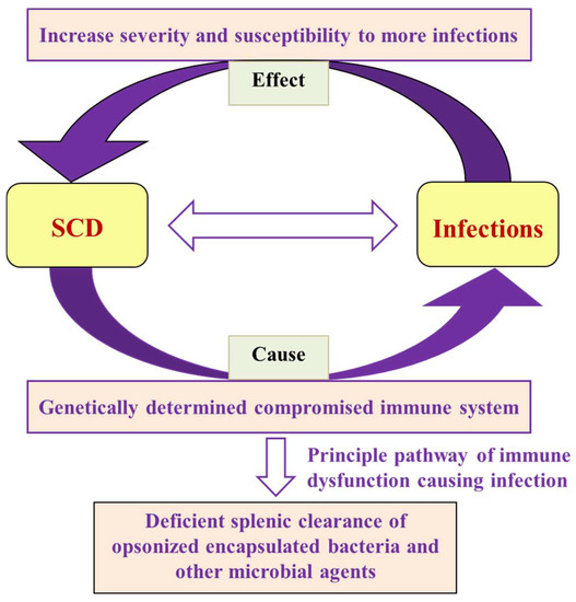 Individuals with splenectomy and individuals with non- or partially functioning spleens (hypo or asplenism), as in SCD, are more vulnerable to infections. Hyposplenic and asplenic individuals lack IgM memory B cells (as stated above, the spleen is a major site of their generation or function). Thus, it cannot provide a rapid, precise response to encapsulated species of microorganisms, particularly Haemophilus influenzae type b (Hib), salmonellae, and pneumococcal infections [15]. Local infections can easily become systemic, which, combined with the loss of spleen filtering function, can contribute to the development of severe sepsis. The risk of infection in children under the age of five with SCD is nearly thirty to a hundred times higher than in healthy children, implying that SCD children are more vulnerable to invasive pneumococcal disease (IPD), including pneumonia, meningitis, and septicemia [16]. In addition, patients with SCD have a 25 times higher risk of salmonella infections, particularly in older children and adults [17]. The factors associated with increased SCD infections may be related or unrelated to the immune system. Few infections can occur as a result of treatment.