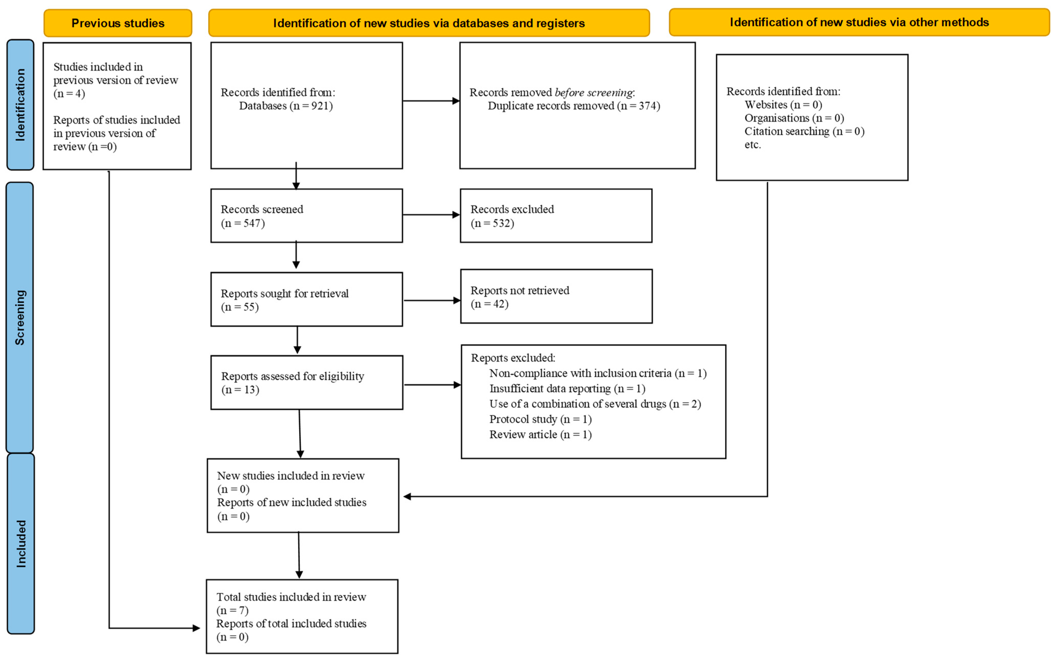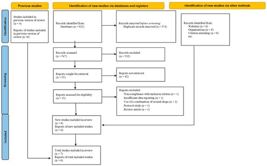 Among 921 results found in the databases, 13 studies were evaluated according to eligibility and presented in full text after the screening. Eventually, seven studies (n = 291) with eligible criteria were included in the current systematic review. In addition, seven studies were excluded for various reasons, namely non-compliance with inclusion criteria [], insufficient data reporting [], using a combination of several drugs [,], a protocol study [], and a review article []. The data selection process has been represented in the PRISMA diagram (Figure 1).