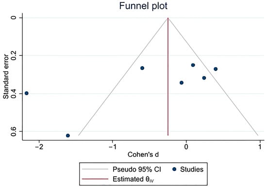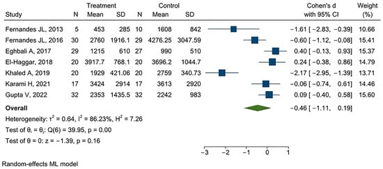 Seven studies provided data for serum ferritin (n = 291) [,,,,,,]. The pooled Cohen’s d for serum ferritin was estimated at −0.46, 95% CI −1.11 to 0.19, and p = 0.16 (I2 86.23%, p < 0.0001) (Figure 2).