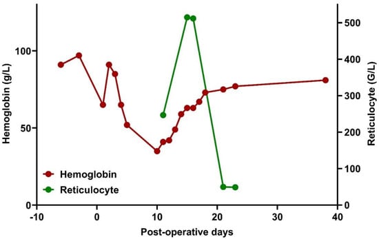 For the treatment of HHS, high-dose methylprednisolone (500 mg/day for 5 days, equal to 8 mg/kg/day) and intravenous immunoglobulin (IVIG, 30 g/day for 5 days, equal to 0.4 g/kg/day) were initiated. In addition, the patient received three doses of erythropoietin (40,000 IU epoetin alpha, weekly). Methylprednisolone was gradually tapered down to a dose of 0.5 mg/kg. Although the general condition improved moderately, hemodynamic instability did not develop. A gradual increase in his hemoglobin level stabilized on postoperative day +21, with a concomitant normalization of the reticulocyte count (Figure 1). Blood products were not administered despite extreme anemia (39 g/L).