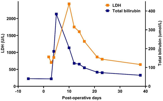Under supportive therapy, his condition gradually improved; the Hgb level increased to the preoperative level of 91 g/L, the need for vasopressor therapy was resolved, and extubation could be performed. However, on the third day of ICU treatment (postoperative day +3), the patient developed jaundice, hemoglobinuria, fever, and an elevation of inflammatory markers. Hgb level decreased to 52 g/L, equivalent to a 43% reduction from baseline. The possibility of recurrent hemorrhage was ruled out, and hepatic or post-hepatic causes of jaundice were also excluded. A marked elevation of LDH and indirect bilirubin was explained by hemolysis (Figure 2).