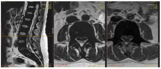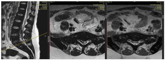 In the T2 sequence, there is a low signal in the anterior epidural space, along with an inhomogeneous signal in the T1 sequence. These findings suggest compressive effects on the dura at the level of L2, extending to the posterior parts of the spinal canal until the final segment. Additionally, a segment of this compression seems to extend along the course of the midline fissures on the right side, specifically at the levels of L5–S1 and S1–S2, causing mild compressive effects on the nerve roots.
