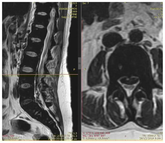 A 36-year-old Greek woman diagnosed with transfusion-dependent β-thalassemia (TDT) (IVSI-n1/-44bp del) presented with a sudden onset of lower extremity motor impairment, pelvic paresthesia, and bladder dysfunction. She had been experiencing persistent lower back pain for the past six months, with recent aggravation over the last month, accompanied by bilateral lower limb weakness. The patient was following a systematic transfusion schedule with hemoglobin levels maintained above 9.5 g/dL every 15 days, as per guidelines. Additionally, she underwent iron chelation therapy with deferoxamine/deferiprone, but with poor compliance. Her mean hemoglobin (Hb) was 10 g/dL, and the mean ferritin level was 8500 μg/L, reaching a maximum of 12,200 μg/L (the patient’s main hematological and biochemical parameters are summarized in Table 1). Myocardial T2* value indicated 5 milliseconds (severe myocardial iron overload), while the liver T2* value was estimated at 1 millisecond, indicative of a high iron concentration in the liver (20 mg/g dry tissue). Upon admission, vital signs were stable, with a body temperature of 37 °C, blood pressure at 110/70 mm Hg, respiratory rate of 16/min, heart rate of 90 beats per minute, and oxygen saturation at 99% on room air (FiO2: 21%). A physical examination revealed hepatosplenomegaly and a systolic heart murmur. Neurological examination at admission demonstrated that the patient had difficulty rising from a sitting position and walking due to inability in flexing and extending the plantar fascia in both lower limbs (grade of muscle strength 2/5 in both lower limbs), along with impaired Achilles tendon reflexes. The patient also exhibited complete urinary retention and sensory cauda equina syndrome at the S3 level. The basic laboratory work-up yielded no significant findings, and the absence of acute infection was confirmed through negative results in multiple blood and urine cultures, inflammatory markers, and serological markers.