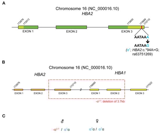 Figure 1. (A) Human HBA2 gene located on chromosome 16 (NCBI RefSeq Accession: NC_000016.10) between 172876–173710. The three exons of HBA2 are shown as green blocks. Light green in exon 1 represents 5′ UTR, and in exon 3, it represents the 3′ UTR. The polyadenylation signal (AATAAA) is located between 173689 and 173694. In the αT variant (HBA2:c.*94A>G; rs63751269), this sequence is altered to AATAAG. (B) Human HBA2 and HBA1 genes are located on human chromosome 16 (NCBI RefSeq Accession: NC_000016.10) between 172876–173710 and 176680–177522, respectively. The three exons of HBA2 are shown as orange blocks, while the three exons of HBA1 are shown as yellows blocks. The −α3.7 variants involves a deletion of 3.7 kilobases as indicated by the red dashed box. (C) Genotypes of the studied couple.
