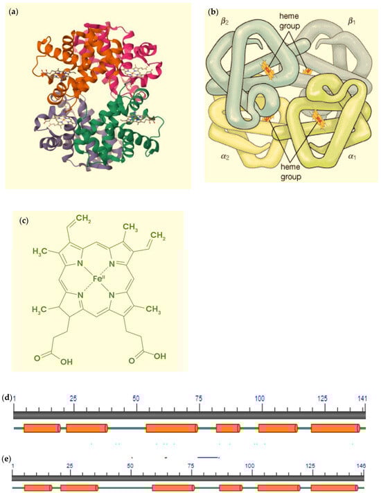 Hemoglobin is a tetrameric protein consisting of four subunits (Table 1), each composed of one polypeptide chain and one heme group [30,31] (Figure 1). The heme group, iron protoporphyrin IX, is crucial for hemoglobin’s oxygen-binding capability. Each polypeptide chain in hemoglobin is linked to a heme group, where the ferrous ion (Fe2+) in the heme is coordinated to the nitrogen atom of a histidine residue within the polypeptide chain. Additionally, the porphyrin ring of the heme is stabilized by interactions with a phenylalanine residue from the polypeptide chain.