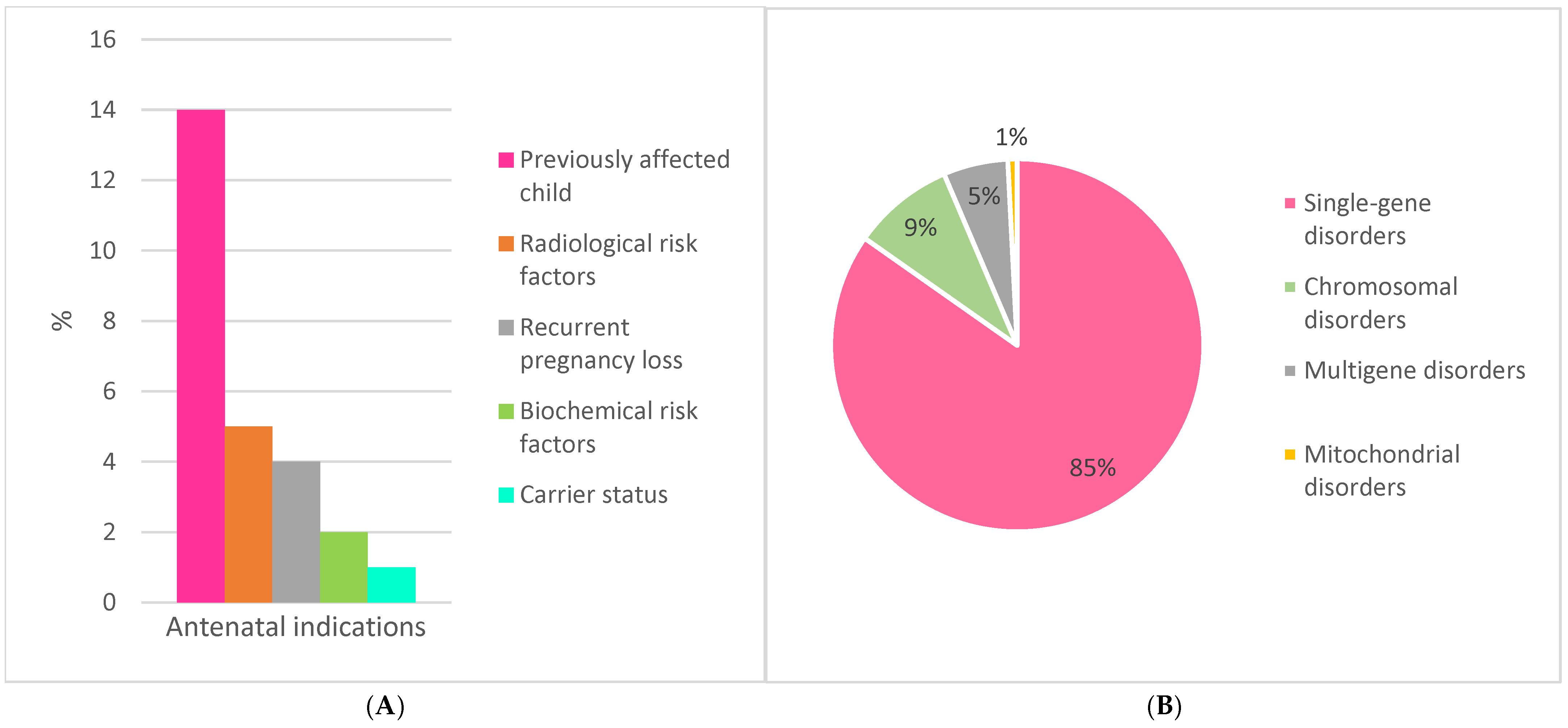 Antenatal indications included: previously affected child (14%), radiological risk factors (5%), recurrent pregnancy loss (4%), biochemical risk factors (2%), and carrier status (1%) (