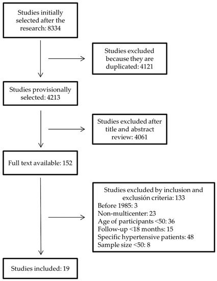 After removing duplicate studies in the initial search, a preliminary selection was made by reading the title and summary of each study. The original studies of those selected were obtained and subjected to an in-depth reading in order to choose those that fulfilled inclusion and exclusion criteria. Of the total number of clinical trials identified, those selected had been published after 1985, had a sample size of at least 50 persons, and the interventions that were performed were multicenter and involved one, two, or more drugs to achieve normal BP figures. Those studies in which participants were younger than 50, that had a follow-up of less than 18 months, or that focused on particular hypertensive patients who also had other diseases such as diabetes or chronic kidney disease were ruled out. All the information gleaned from the documents was recorded in data collection sheets designed for this purpose. Observational studies, revised articles, and follow-up assessments of subgroups of primary studies were excluded. Figure 1 shows the flow chart of the selection process.