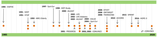 Raised isolated systolic BP was the criterion for participating in the SHEP (Systolic Hypertension in the Elderly Program) [9], Syst-Eur (Systolic hypertension in Europe) [12,20], LIFE (Losartan Intervention For Endpoint reduction in hypertension study) [16], and HYVET (Hypertension In the Very Elderly Trial) [21] studies (n = 5) as well as in the SPRINT (Systolic blood PRessure INtervention Trial) [24] trial and HOPE-3 (Heart Outcomes Prevention Evaluation) [25], albeit with some additional cardiovascular risk factors (n = 2). The criterion for participating in HOT (Hypertension Optimal Treatment study) [13] (n = 1) was having high diastolic BP, while for the studies EWPHE [8], MRC-Elderly (Medical Research Council in Elderly) [11], STOP (Swedish Trial in Old Patients with hypertension) [10], and VALUE (Valsartan Antihypertensive Long-term Use Evaluation) [19], the criterion was the elevation of both the systolic and diastolic BP values (n = 4). This last criterion was required, along with having other cardiovascular risk factors (CVRFs), in the studies ALLHAT [14,17] and CONVINCE (COlchicine for preveNtion of Vascular INflammation in non-CardioEmbolic stroke) [18] (n = 3). The criterion for participating in PROGRESS (Perindopril pROtection aGainst REcurrent Stroke Study) [15], ONTARGET (ONgoing Telmisartan Alone and in combination with Ramipril Global Endpoint Trial) [22], TRANSCEND (Telmisartan RANdomised assessment Study in aCE iNtolerant subjects with cardiovascular Disease) [23], and new CONVINCE [26] studies was having suffered some type of cardiovascular disease (n = 4).