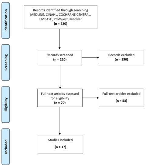 A total of 220 studies were retrieved. After reading the titles and abstracts, 150 studies were excluded. After reading the full articles, a total of 53 articles were excluded and 17 articles were included which met the inclusion criteria (Figure 2). All identified publications were collated and fed into Endnote X10 software. The evidence-based strategies issued are to support critical care nurses to manage critical patients in the intensive care unit during the COVID-19 pandemic. Four recommendations and rationales were issued by the expert panel based on evidence.