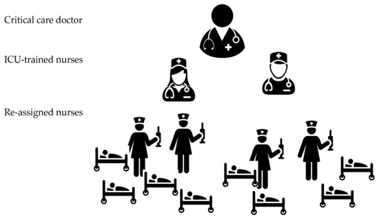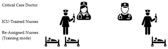 The tiered staffing strategy combines experienced ICU nurses with reassigned hospital nurses. Instead of the regular care delivery model where each ICU nurse provides care for one to two patients (Figure 2), in this strategy, each ICU-trained nurse will supervise and direct other two re-assigned nurses who have useful skills but lack experience in the ICU setting to ultimately provide care for four critically ill patients. ICU physician(s) trained in critical care or those who regularly manage ICU patients will oversee all nurse teams (Figure 3) [12,13,21,22].