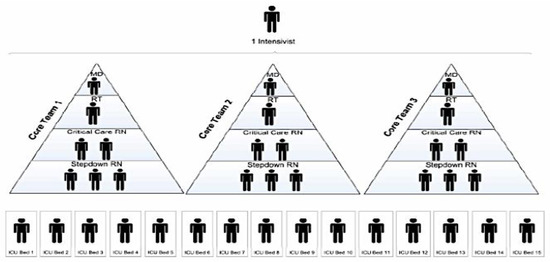 The team is led by an ICU physician who works with a respiratory therapist trained in critical care and 2 ICU nurses who supervised 3 step-down nurses. Each team provides care for 15 patients [12].