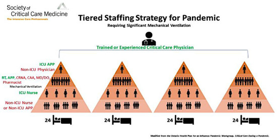 The report of the Ontario Health Plan for an Influenza Pandemic presented an example of a tiered strategy and called it Care Team Model (Figure 4). In this model, healthcare workers who have useful skills but lack experience in critical care can work in teams supervised by experienced staff and collectively care for a larger group of patients. In place of an individual specialized nurse caring for one to two patients, a team of mixed experienced nurses provides the care for a group of patients. This is possible because in combination, they have the complete skills set and pertinent experience required to care for expanded patient numbers. In this example, one intensivist can supervise three teams, each composed of one physician, one respiratory therapist and two ICU nurses who supervised three step-down nurses. Each one of the 3 teams will take care of 5 patients and the 3 teams together will provide care to 15 patients [10,11]. The care team model focuses on the provision of care by a team of healthcare workers. Teams would be created with feedback loops and operate under this designated hierarchy and guided by expected job functions and responsibilities. This model has proven to be effective in past emergencies [10,11,15,16].