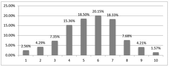 Life satisfaction scale: SWLS—the satisfaction with life scale, (E. Diener, R. A. Emmons, R.J. Larson, and S. Griffin) [10]. The scale contains five items rated on a seven-point scale. The respondent assesses to what extent each of the statements applies to their life so far. The object of measurement was the assessment of satisfaction with life, which results from comparing one’s own satisfaction with the standards set by oneself. The points were totaled and the obtained result, in the range from 5 to 35, determined the degree of satisfaction with life. When interpreting the results, one should follow the properties characterized by the sten scale. Scores within 1–4 sten were assumed to be low, and within 7–10 sten assumed to be high, which corresponds to the area of 33% of the lowest scores and the same number of the highest scores on the scale. Results within 5–6 sten are considered as average. Cronbach’s alpha reliability index is satisfactory and amounts to 0.81. The scale was adopted to Polish conditions [9].