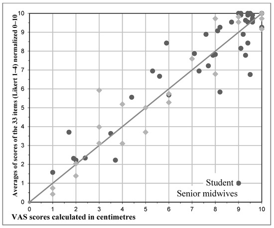 Pearson Correlation Coefficients: for the forms of the 10 preceptors who ≥4 evaluations from students, a comparison between the averages of scores of the 33 items (Likert 1–4), normalized 0–10 and VAS scores given by students and senior midwives calculated in centimeters was made, obtaining a Pearson Correlation Coefficient r = 0.78.