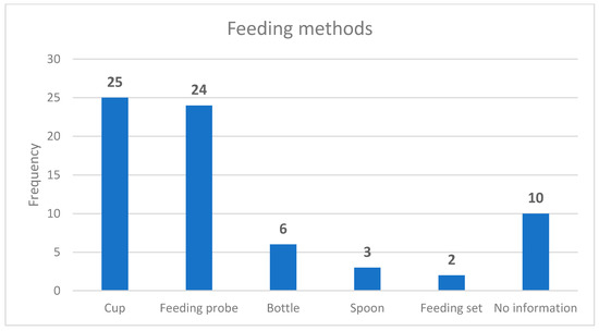 Feeding methods were included in 28 guidelines, and 10 provided no information about feeding methods (Figure 1). The most common feeding methods were cup feeding and feeding probe. Supplemental feeding was suggested mainly as infant formula (n = 32) and breastmilk (n = 27); six guidelines made no suggestions.