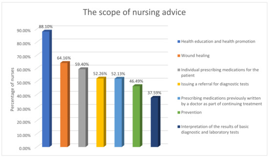 The nurses argued that the scope of “nursing advice” should most often include health promotion and health education (88.10%). More than half of the people stated that the “nursing advice” should include the selection of a wound treatment method (64.16%), prescribing certain medicinal products and medical devices to which the nurse is entitled (59.40%), issuing referrals for basic diagnostic tests, including laboratory tests (52.26%), or prescribing medicinal products prescribed by a doctor as a follow-up (52.13%). As much as 46.49% of the respondents indicated that the “nursing advice” should include the interpretation of the results of basic diagnostic tests, including the results of laboratory tests (Figure 1).