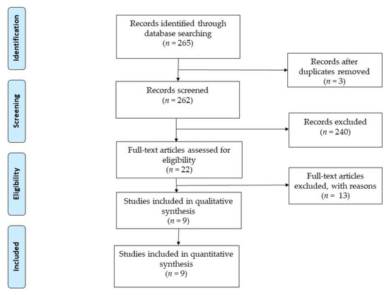 The search strategy produced a total of 265 potentially relevant studies: 134 in PubMed, 89 in SCOPUS, 36 in Cochrane and 9 in Dialnet. Two researchers carried out the search separately. We reviewed the titles and abstracts of a total of 265 articles in order to identify any duplicate and/or unrelated documents; 243 duplicate and/or unrelated documents were excluded after reading the title and abstract. Subsequently, 2 researchers independently reviewed the remaining 22 full-text articles and 13 more were excluded due to not meeting the selection criteria. Finally, 9 articles were found eligible and were included in this systematic review. The selection process can be seen in Figure 1.