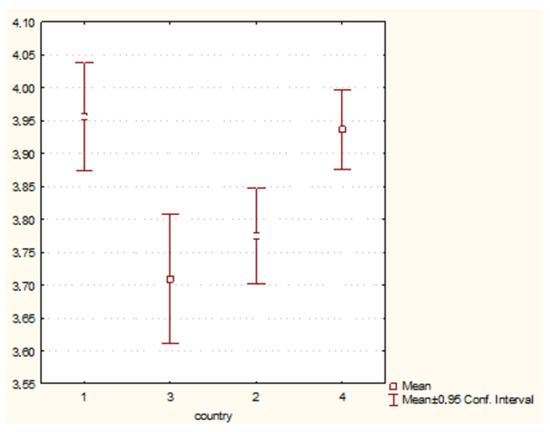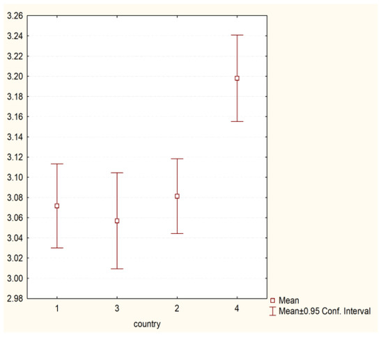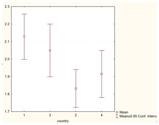 Figure 3. Psychosocial health behaviour and country of origin (H = 22.70252 p = 0.0000). Legend: 1—Poland, 2—Hungary, 3—Greece, 4—Turkey.