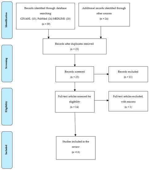 The PRISMA flow diagram guided the process of retrieval and the screening of studies (see Figure 1) after the most relevant articles were identified through the search process. In the article retrieval and screening process, a total of 83 studies were initially retrieved. Out of these articles, the screening process commenced, and 58 articles were removed due to duplication. The remaining 25 studies were subjected to the full-text examination to check their objective and relevance to the research question and a further 11 were excluded, and 1 article was removed.