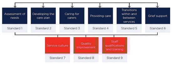 The Australian national palliative care standards. Standard 1 pertains to the patient’s multi-faceted needs, and standard 2 involves consultative drafting of personalised care plans for patients [4]. Standard 3 addresses the needs of the patient’s carers/family, and standard 4 fine-tunes consultative planned care [4]. Standard 5 proffers smooth transitions and interdisciplinary care, and standard 6 tends to grief/loss support for families and carers [4]. Standards 7 and 8 pertain to priming palliative service environment and quality [4]. Standard 9 optimises staff qualifications, efficiency, training, and performance [4].