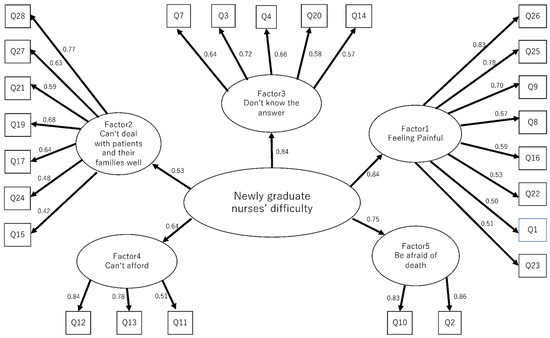 Table 2 shows the results of the exploratory factor analysis. We completed the NDEC scale with five domains and 25 items. Each domain was titled: Factor 1, “Feeling Painful”; Factor 2, “Can’t deal with patients and their families well”; Factor 3, “Don’t know the answer”; Factor 4, “Can’t afford”; and Factor 5, “Being afraid of death”. Using the factor structure identified as a result of the exploratory factor analysis, a confirmatory factor analysis was conducted (Figure 1). The model adopted was a higher-order factor model, in which the five factors extracted as latent variables of the questionnaire items, which were observational variables, were primary variables, and the secondary factor, which was a higher-order factor explaining the primary variable, was difficult. The model fitness index for the NDEC scale was X2 = 632, p < 0.001, degree of freedom = 270, GFI = 0.770, AGFI = 0.720, CFI = 0.790, and RMSEA = 0.080. Table 3 shows the results of criteria validity, confirmed by the correlation between the NDEC scale total score and the NRS, with a correlation coefficient of 0.43. The score of each factor and the NRS ranged from 0.25 to 0.40. Table 4 shows the result of known-group validity; we confirmed a significant difference between the NDEC scale total scores of the NGNs and GNs as well as the scores of each factor.