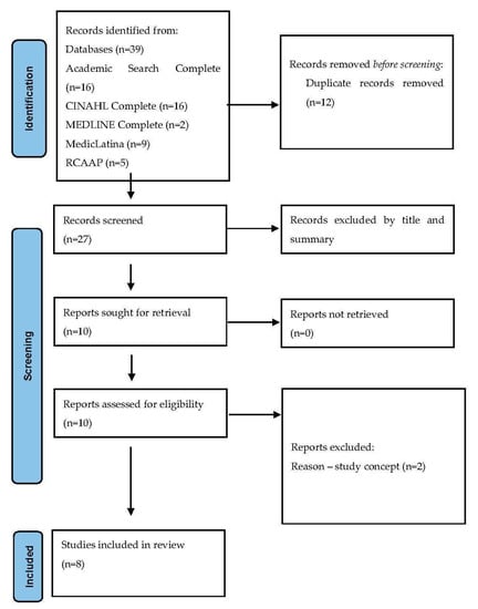 Eight studies were selected, four in Portuguese [,,,] and four others in English [,,,]. Out of these included studies, one fits in the quantitative paradigm [], three in the quantitative paradigm [,,], three have a mixed approach [,,] and one is a systematic review of the ScR type [].