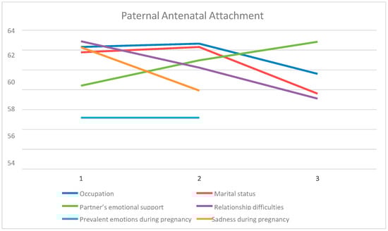 According to the Scheffé post-hoc criterion, in terms of occupation, there is a statistically significant difference among private-sector employees and freelancers (p = 0.016). Private-sector employees seemed to have greater paternal antenatal attachment, with 3.9% proportion of the variance explained by this variable. Regarding marital status, a statistically significant difference appeared among all three sub-categories (p = 0.026). Those with a cohabitation agreement showed greater paternal antenatal attachment than the other two groups, followed by married ones, and lastly those living together without a cohabitation agreement. The proportion of the variance explained was 3.4%. The men who felt very much supported by their partners reported greater paternal antenatal attachment compared to those with moderate or no support (p = 0.001), with 6.6% of the variance explained. Furthermore, the results revealed an overall tendency of significantly greater paternal antenatal attachment for the participants who had no relationship difficulties, in comparison to those who had relative and moderate difficulties. Between the last two groups, those with relative difficulties showed higher prenatal attachment (p < 0.001). The proportion of the variance explained was 8.0%. The largest proportion of the variance (20.9%) in the current study was explained by prevalent emotions during pregnancy, where those being very happy during pregnancy had greater paternal antenatal attachment than those who reported being ‘just’ happy (p < 0.001). None of the participants expressed negative prevalent emotions. Finally, a 4.3% proportion of the variance was explained by the independent variable of sadness during pregnancy (p = 0.009). Analysis showed that those with no such emotion experienced greater paternal antenatal attachment in relation to those with a small to moderate presence of sadness (Table 2). Figure 1 shows the relationship of the means of paternal antenatal attachment according to the independent variables after univariate analysis (ANOVA).